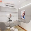 Chúng tôi khéo léo tăng cường nhận diện thương hiệu cho mẫu thiết kế phòng khám nha khoa nhờ việc setup vách backdrop khung thạch cao uốn nổi, nẹp viền inox mạ xi vàng kết hợp đèn led dây hắt viền tôn lên logo và tên cơ sở y tế làm từ inox mạ xi vàng cắt CNC.