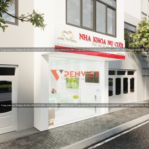 Phần biển bảng phía ngoài mặt tiền được làm từ khung sắt mạ kẽm, bọc Aluminum Alcorest ngoài trời 3mm. Phần logo thương hiệu thì được thiết kế từ chất liệu alu vàng gương với chân formex. Bộ chữ “Nha khoa nụ cười” thì bằng mica hộp không phát sáng. Bộ chữ “Take care of your smile” với mặt alu vàng gương gắn chân formex. Tấm biển này sẽ giúp cửa hàng trông nổi bật và sáng hơn cả về đêm.