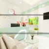 Một chiếc quầy lễ tân màu xanh mint rất đẹp mắt được đặt ngay ngắn trước tấm vách logo có phần khung thép mạ kẽm 30x30 và ốp gỗ nhựa planwood 2 mặt ở phía sau. Chất liệu để tạo nên chiếc quầy lễ tân này là từ gỗ MDF chống ẩm Thái Lan phun sơn 2K phủ bóng. Những bóng đèn led trang trí được gắn phía trước mặt quầy để giúp khu vực này thu hút hơn.