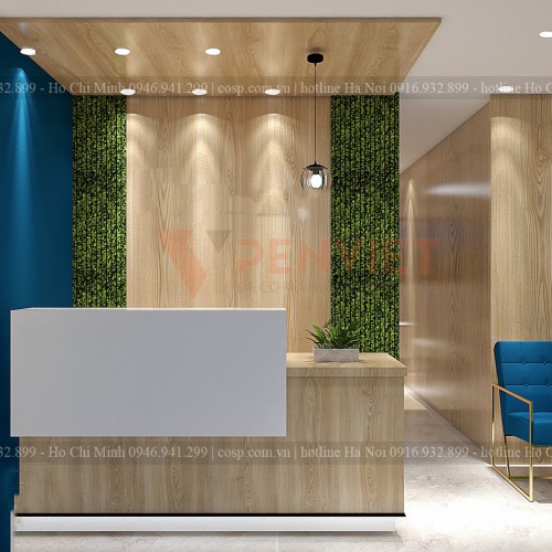 Thiết kế khu vực tiếp tân hiện đại, đơn giản. Bàn thu ngân được thiết kế chuyên dụng cho phòng khám. Phía sau quầy thu ngân là vách logo bằng gỗ có thể làm nổi bật logo và thương hiệu.