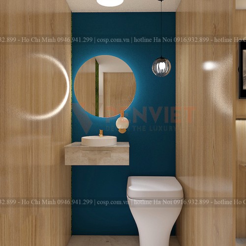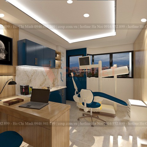 Tổng thể thiết kế phòng khám nha khoa sử dụng cách phối màu sắc theo tỷ lệ 60:30:10. Đây là cách phối màu phổ biến mang lại một tổng thể không gian hài hòa. Tone màu gỗ được sử dụng với tỉ lệ 60% mang lại tổng thể không gian hiện đại, ấm áp. Màu trắng được sử dụng với tỷ lệ 30% mang lại vẻ đẹp tinh tế và sang trọng cho phòng khám nha khoa. Trên nền tông màu sang trọng trắng và màu vàng gỗ, màu xanh da trời được sử dụng để làm nổi bật không gian.