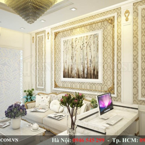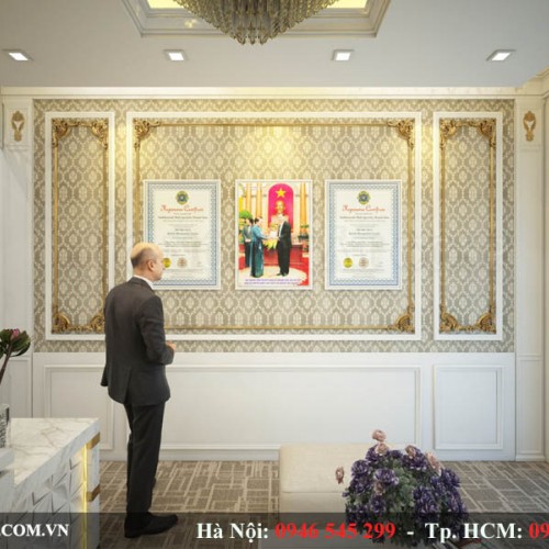 - Chất liệu: MDF sơn Inchem cao cấp, giấy dán tường, nẹp phào