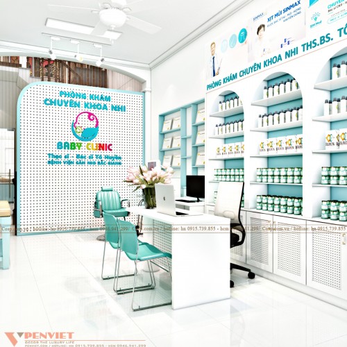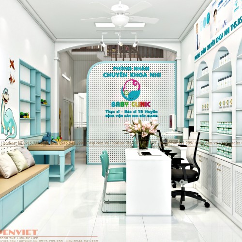 Nhằm hướng đến sự hiện đại, không gian sinh động, chúng tôi tư vấn cho khách hàng thiết kế phòng khám nhi theo phong cách hiện đại. Màu trắng và xanh da trời được lựa chọn làm gam màu chủ đạo mang đến vẻ đẹp nhẹ nhàng, dễ chịu cho không gian.