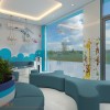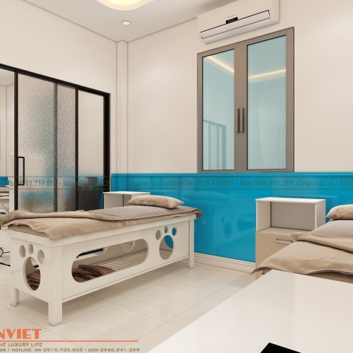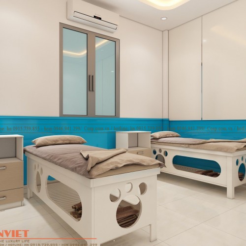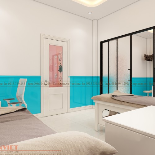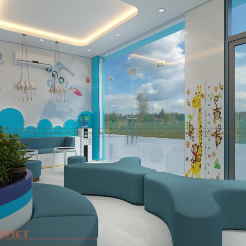 Phong cách thiết kế: lựa chọn phong cách thiết kế hiện đại kết hợp giữa màu trắng và xanh chủ đạo sẽ giúp không gian thông thoáng dễ chịu hơn cho khách hàng. Thêm vào đó, nhiều chi tiết décor trang trí màu sắc tạo dựng tổng thể không gian sinh động giúp trẻ cảm thấy vui vẻ thích thú.