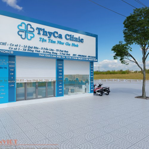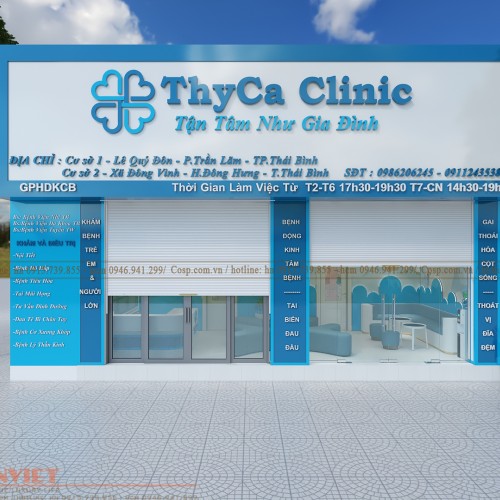 Thiết kế mặt tiền phòng khám nhi ThyCa Clinic mang đến diện mạo mới mẻ hoàn hảo với việc sử dụng hệ biển chính lớn và biển cột. Chất liệu khung sắt hộp 20x20 ốp tấm hợp kim nhôm Alumium được tư vấn lựa chọn cho hệ biển bảng vừa giúp biển bảng bền chắc hơn vừa mang đến vẻ đẹp hiện đại.