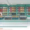 Phía sau quầy thu ngân được thiết kế hệ vách logo ấn tượng nhằm thu hút sự chú ý của khách hàng. Vách logo được dựng bằng gỗ mdf sơn 2k và được bảo vệ bằng lớp kính cường lực 8mm đã làm nổi bật tên thương hiệu và logo bằng chất liệu mica.