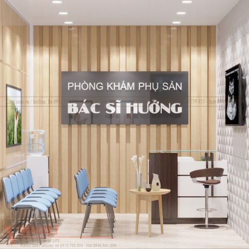 Trước tiên, tôi xin giới thiệu không gian phòng khách- phòng chờ cho các bạn nhé. Khi bước chân vào, các bạn có thể thấy ngay được vách logo phía sau quầy thu ngân được làm từ các tấm nan gỗ nhựa plawood, hậu là gỗ MDF màu vàng gỗ chất lượng. Ở giữa là biển bảng làm từ tấm mica nền nâu với bộ chữ mica không phát sáng "PHÒNG KHÁM PHỤ SẢN" và "BÁC SĨ HƯỞNG" màu trắng.