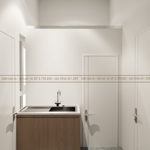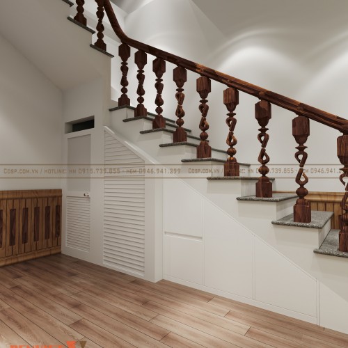 Khu vực chân cầu thang lên tầng 2 được PenViet tận dụng làm hộc tủ đựng các dụng cụ cần thiết. Cách bố trí nội thất này giúp tối ưu không gian, đảm bảo công năng sử dụng và rất khoa học. Mọi vị trí được tận dụng tối đa để hạn chế không gian “ chết” gây mất thẩm mỹ cho công trình.