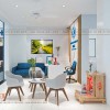 Không gian chờ và tiếp đón khách hàng cũng được chúng tôi bố trí ghế sofa bọc nỉ êm ái với gam màu xanh bắt mắt. Tại vị trí trung tâm, các kiến trúc sư cũng khéo léo đặt bộ bàn ghế gỗ giúp khách hàng trong quá trình chờ đợi thăm khám không cảm thấy bất tiện và khó chịu. Đây cũng là không gian giúp các Dược sĩ trong phòng khám có thể trao đổi, tư vấn tận tình cho bệnh nhân về cách dùng thuốc chi tiết.