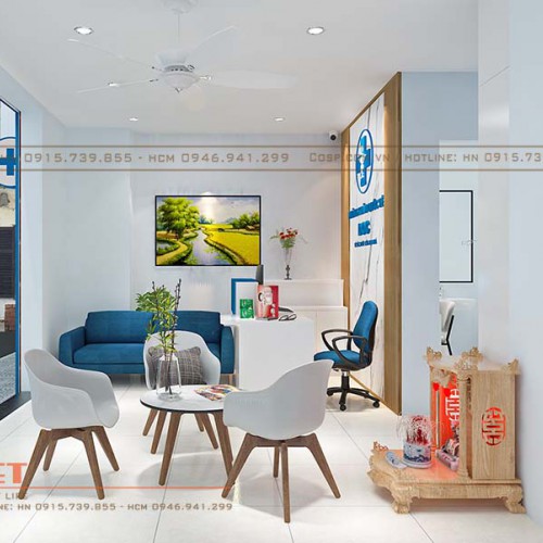 Chúng tôi tư vấn cho chủ đầu tư lựa chọn phong cách thiết hiện đại, sang trọng với gam màu chủ đạo là màu xanh nước biển và trắng. Theo đó, Penviet sẽ tiến hành thi công, xây dựng cải tạo phần thô với các hạng mục như trần thạch cao khung xương Vĩnh Tường, sơn bả lại phần trần và tường để che đi những khuyết điểm về phần thô của phòng khám.