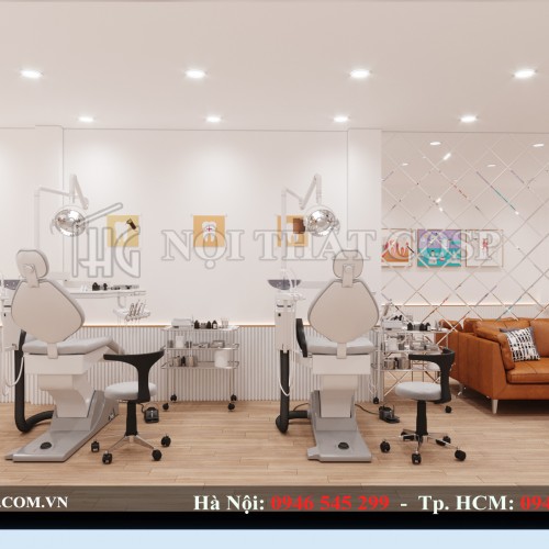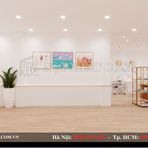 Ngay khi bước vào, khách hàng sẽ cảm nhận được sự chuyên nghiệp với bố cục khoa học của không gian tiếp đón. Quầy thu ngân được đặt ngay tại vị trí gần cửa ra vào để nhân viên có thể tiếp đón và chào tạm biệt khách hàng một cách tiện lợi. Với gam màu trắng làm chủ đạo, chúng tôi đã sử dụng chất liệu gỗ MDF chống ẩm phủ sơn kết hợp vách lam ốp và đi viền inox vàng gương cho quầy thu ngân để tạo điểm nhấn. Phía sau quầy thu ngân là vách logo thương hiệu chất liệu mica phát sáng vô cùng nổi bật tạo dấu ấn cho khách hàng.