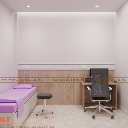 Thiết kế phòng khám phụ khoa với diện tích hơn 10m2 với 1 giường bệnh. Thiết kế hiện đại và đơn giản mang lại sự tối ưu tối đa cho không gian. Hệ nội thất được sử dụng chỉ bao gồm: giường bệnh, bàn làm việc và cải tạo thêm vách ốp chân tường.