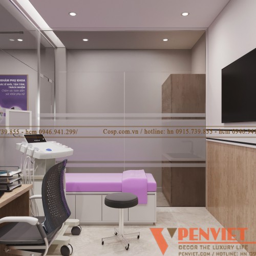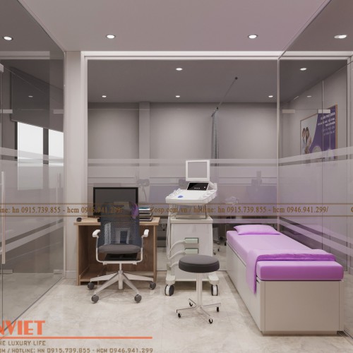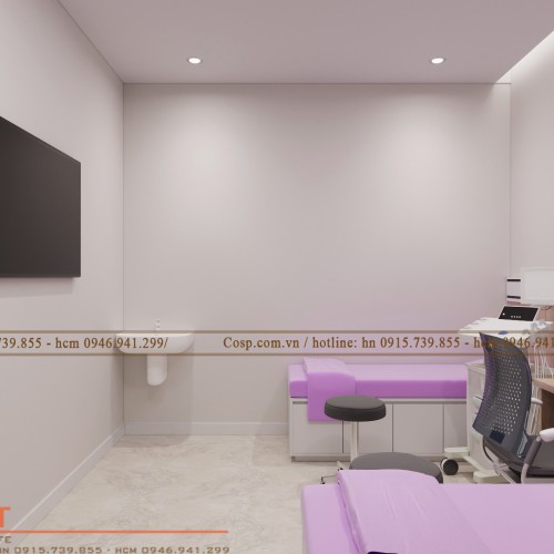Thiết kế phòng khám phụ khoa hiện đại trang bị đầy đủ trang bị thiết bị hiện đại. Không gian phòng khám hẹp và không có cửa sổ, vì thế kts sử dụng hệ cửa kính và bố cục hệ đèn khoa học mang lại không giang thông thoáng nhất có thể.