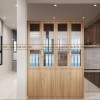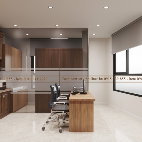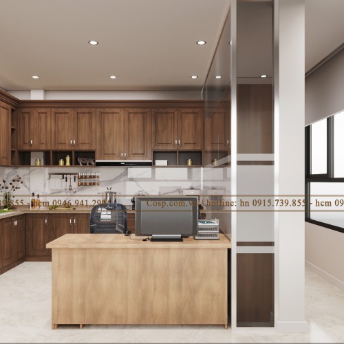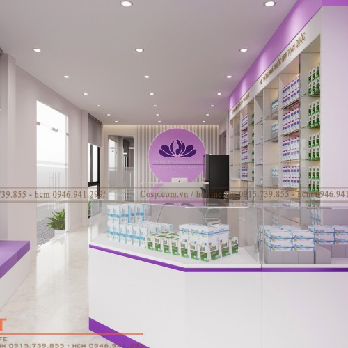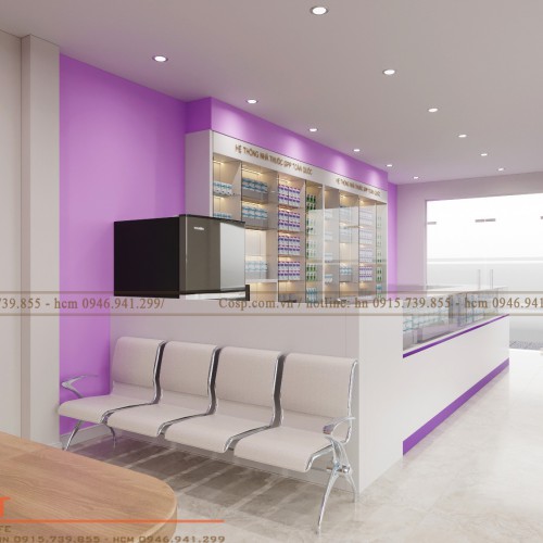 Khu vực quầy thuốc được thiết kế với hệ nội thất gỗ MDF lõi xanh cốt thái bao gồm: tủ thấp dạng chữ L, hệ tủ thuốc sát tường cao kịch trần, bàn làm việc và hệ ghế ngồi chờ.