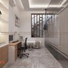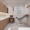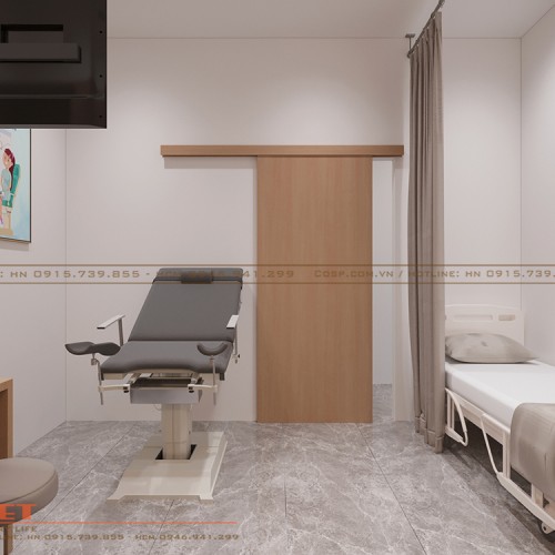 Tiếp đến là không gian phòng khám phụ khoa được bố trí 1 giường nằm, 1 giường khám bệnh, lavabo rửa tay. Khu vực lavabo được ốp đá giúp dễ dàng vệ sinh, lau chùi và hạn chế vi khuẩn phát triển. Yếu tố diệt khuẩn là vô cùng quan trọng khi thiết kế nội thất phòng khám.