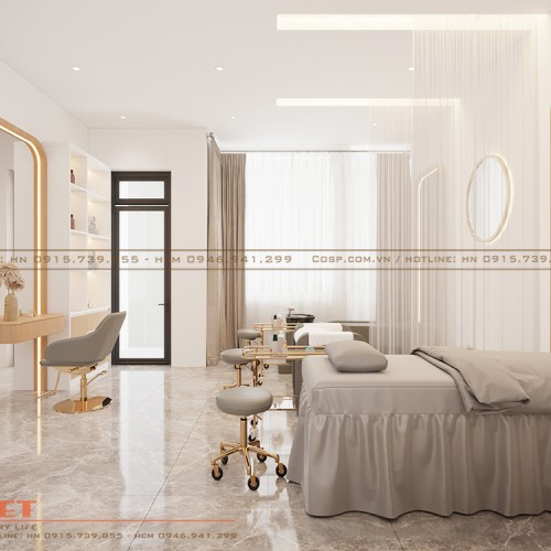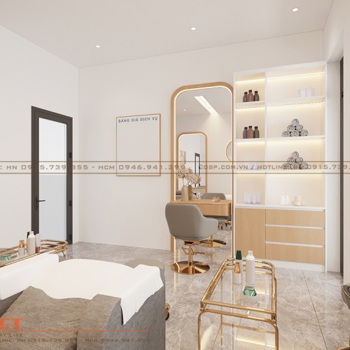 Ngoài ra, tại đây còn có bàn trang điểm để quý khách chải tóc, chỉnh trang lại trang phục sau khi sử dụng xong dịch vụ. Hay mẫu tủ đựng các vật dụng cần thiết cho công việc được chế tạo từ chất liệu gỗ MDF với tính thẩm mỹ cao. Toàn bộ đồ nội thất của phòng gội đầu dưỡng sinh có gam màu vàng nhạt nhẹ nhàng, tạo sự dễ chịu cho khách hàng.