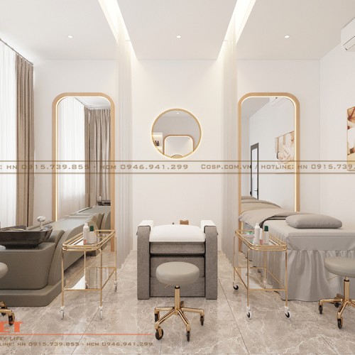 Mỗi giường nằm có bố trí 1 gương soi vừa để tăng hiệu ứng không gian rộng mở vừa giúp khách hàng thoải mái ngắm nhìn mình khi sử dụng dịch vụ. Gương soi thiết kế nẹp viền màu vàng đẹp mắt, ấn tượng thu hút người nhìn.