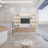Kế đến là quầy lễ tân được làm từ chất liệu gỗ MDF bền bỉ, tính thẩm mỹ cao. Với sự kết hợp 2 gam màu trắng, be đan xen cùng đường nét phá cách giúp quầy lễ tân thêm phần nổi bật.