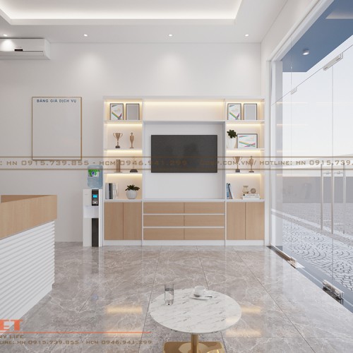 Bên phải cửa ra vào là tủ trưng bày các vật phẩm, kỷ niệm chương, giấy chứng nhận của phòng khám. Tủ có nhiều ngăn nhỏ được setup đèn LED chiếu sáng giúp làm tôn lên các vật phẩm trưng bày bên trong.