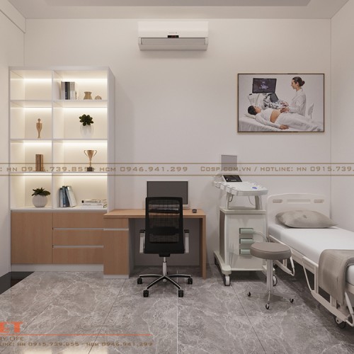 Phòng siêu âm trong thiết kế phòng khám sản phụ khoa Vuông Tròn có bố trí giường nằm, tủ đựng đồ, bàn ghế làm việc, máy móc thiết bị. Các đồ nội thất được sắp đặt gọn gàng, thể hiện sự chuyên nghiệp của phòng khám. Tại đây, chị em phụ nữ được thăm khám dưới bàn tay của đội ngũ y bác sĩ giàu kinh nghiệm, giỏi chuyên môn. Mọi vướng mắc sẽ được các y bác sĩ giải đáp nhiệt tình, chu đáo nhất.