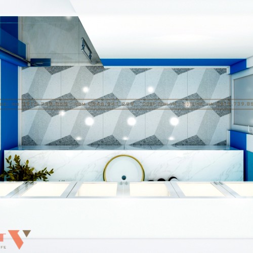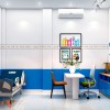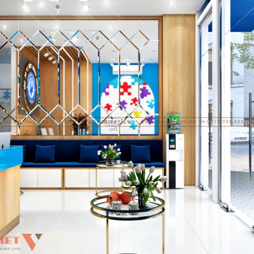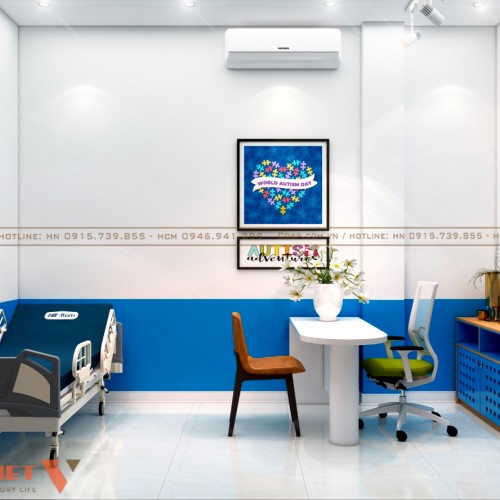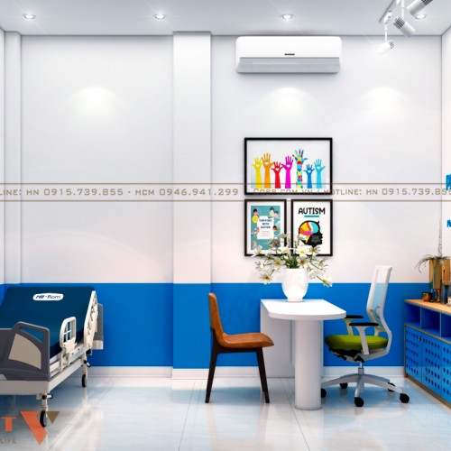 Màu sắc: Màu sắc khi thiết kế phòng khám tâm lý được sử dụng theo tỉ lệ vàng 60:30:10. Cụ thể 1 màu trắng chủ đạo chiếm 60% không gian (bao gồm là tường, sàn), 1 màu xanh chiếm 30% không gian (màu của đồ nội thất) và cuối cùng là màu điểm nhấn chiếm 10% không gian. Sự phối hợp màu sắc linh hoạt theo thực tế không gian chức năng đã mang đến một diện mạo mới mẻ, tích cực và đầy năng lượng.