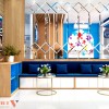 Trang trí décor phòng lễ tân sử dụng nhiều chi tiết như: vách gương ghép tạo phản xạ ánh sáng, vách logo tôn lên bộ nhận diện thương hiệu, và trang trí vẽ tường khiến không gian trở nên sinh động và tươi mới hơn.