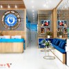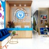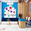 Để tăng độ nhận diện thương hiệu, không thể bỏ qua cải tạo vách tường sau bàn tư vấn với vách logo nổi bật và thu hút. Chất liệu mica sử dụng cho logo và tên thương hiệu giúp khách hàng sẽ thêm ghi nhớ về thương hiệu.