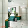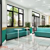 Tiếp đến là khu vực chờ. Hiểu được cảm giác lo lắng của bệnh nhân và người nhà khi chờ đợi đến lượt khám. Chủ đầu tư đã thiết kế khu vực chờ hiện đại, sạch sẽ với những chiếc ghế sofa thư giãn, bằng khung gỗ tự nhiên kết hợp gỗ công nghiệp, bọc da màu xanh, bàn trà khung chân sắt sơn tĩnh điện, mặt đá marble. Không chỉ có thế, chủ đầu tư đã “cố tình” thiết kế khu vực này thành cụm để tạo điều kiện giao lưu cho những người bệnh đến khám bệnh tạo sự thoải mái thư thái phần nào giảm bớt những lo lắng cho bệnh nhân và người nhà. Đôi khi những điều đơn giản này lại khiến bệnh nhân cảm thấy ấm lòng và tin tưởng rằng mình đã lựa chọn đúng nơi để khám chữa bệnh.