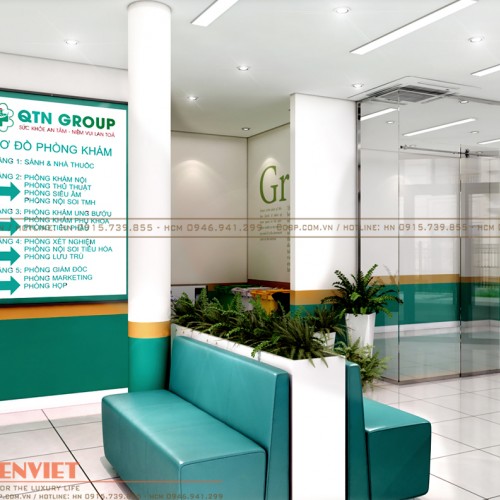 Khu vực sảnh hành lang bố trí một quầy hướng dẫn được đặt ngay cửa vào thuận tiện đón tiếp bệnh nhân. Quầy được làm bằng gỗ MDF cốt xanh chống ẩm, xẻ rãnh màu xanh. 2 phía bên tường bố trí 2 ghế băng chờ bằng gỗ tự nhiên kết hợp gỗ công nghiệp, bọc da. Trên tường phía sau ghế bên tay phải có thiết kế logo + chữ “QNT Group” chân fomex mặt alu in UV không phát sáng. Bộ chữ slogan” sức khỏe an tâm – niềm vui lan tỏa” bằng mica dẹt. Biển chỉ dẫn mặt mica trắng sữa, chữ cắt dán đề can. Phía tường phía bên ghế chờ kia có decor tranh hình ảnh bác sĩ tươi cười vui vẻ tạo cảm giác thân thiện dễ mến như muốn động viên tinh thần bệnh nhân hãy yên tâm.