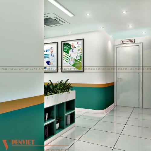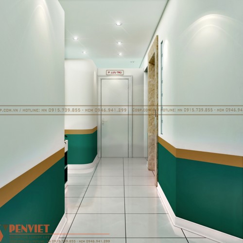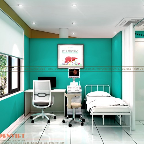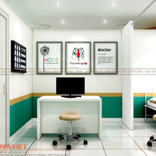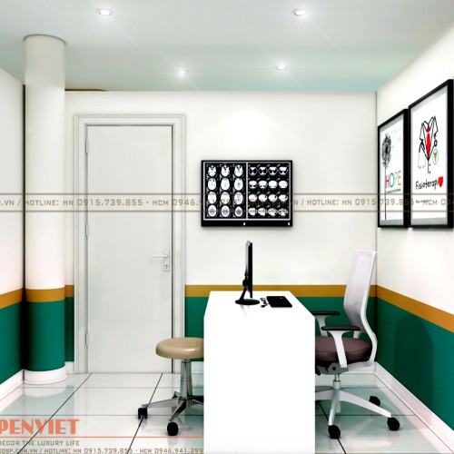 Đi hết khu vực sảnh chờ rẽ bên tay phải bạn sẽ đến ngay phòng khám nội. Trong thiết kế phòng khám màu sắc, ánh sáng trong phòng bệnh có ảnh hưởng mạnh mẽ đến tâm lý người bệnh cũng như người nhà. Nắm bắt được điều này, KTS Penviet đã thiết kế phòng khám nội với gam màu trắng làm chủ đạo, kết hợp với màu xanh cùng chất liệu gỗ để tạo sự sang trọng ấm cúng nhẹ nhàng, dễ trang trí mang lại tính thẩm mỹ cao phù hợp với phòng khám cần sự yên tĩnh, thoải mái.