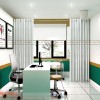 Phòng khám nội bố trí bàn làm việc bằng gỗ MDF cốt xanh Thái Lan chống ẩm phủ melamine. Không gian phòng khám nội còn được decor với rèm, tranh ấn tượng.