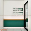 Vách ốp tường bằng gỗ MDF cốt xanh Thái Lan chống ẩm phủ melamine màu trắng kết hợp xẻ rãnh. Hệ viền inox V quanh vách, alu cắt CNC hình vuông màu xanh
