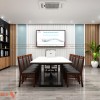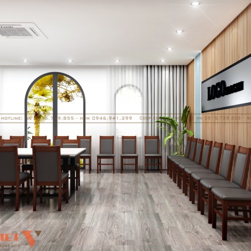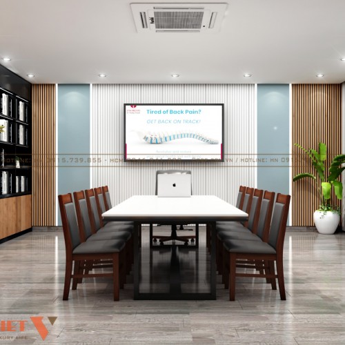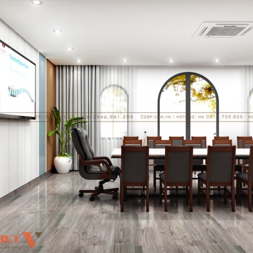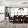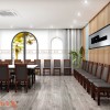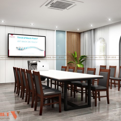 Phòng họp nổi bật với bộ bàn ghế kích thước lớn đặt chính giữa không gian. Bộ bàn ghế làm từ chất liệu gỗ bọc đệm êm ái với thiết kế đơn giản nhưng không hề đơn điệu.