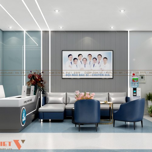 Sảnh đón bệnh nhân của phòng khám khá rộng rãi với nhiều khu vực ngồi chờ khác nhau. Với gam màu xanh ghi kết hợp mang đến cho người nhìn cảm nhận sự thời thượng, hiện đại trong phong cách thiết kế.