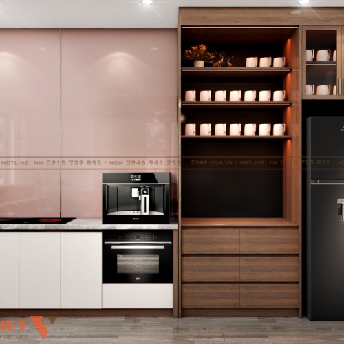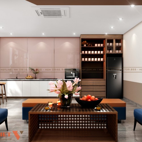 Ngoài ra, tại đây còn setup quầy lavabo, các loại tủ kệ đựng đồ dùng cần thiết cho nhân viên. Cùng nhau ăn chiếc bánh, nhâm nhi ly nước và trò chuyện tán gẫu sau giờ phút làm việc căng thẳng sẽ tiếp thêm sức mạnh và đam mê hoàn thành công việc cho nhân viên.