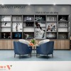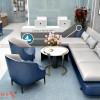 Góc bên phải cửa ra vào được setup bộ bàn ghế sofa êm ái với kích thước lớn. Phía sau ghế là vách trang trí với các đường kẻ lam sọc dọc đẹp mắt. kết hợp đèn LED chiếu sáng nổi bật.