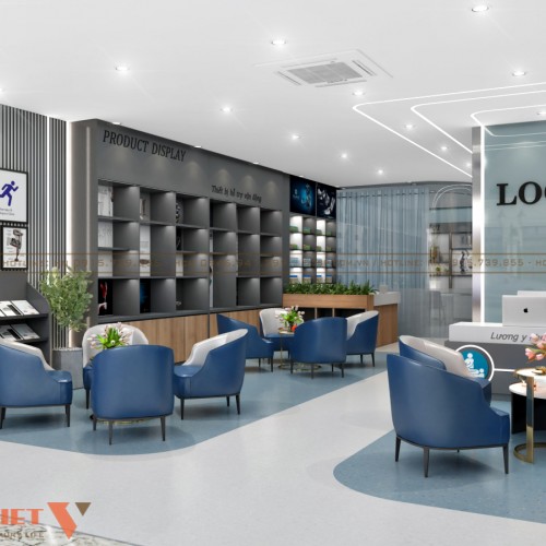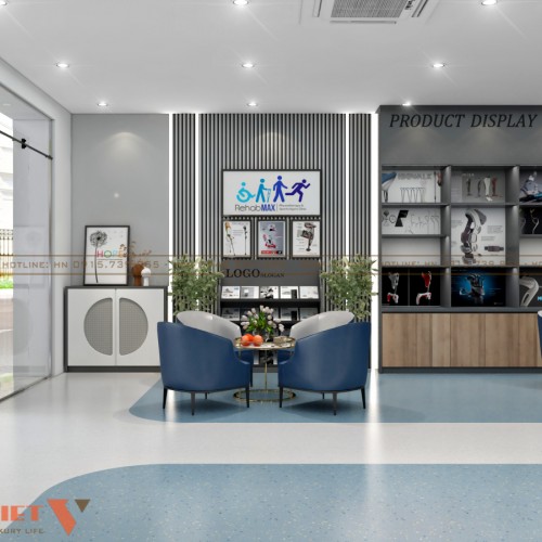 Góc bên trái của phòng khám cũng được bố trí các bộ bàn ghế sofa đơn tiếp đón khách. Ngoài ra còn có các hệ tủ sát tường để trưng bày các sản phẩm hỗ trợ vận động cho bệnh nhân. Đây là cách quảng cáo sản phẩm bán hàng tinh tế giúp phòng khám gia tăng doanh thu.