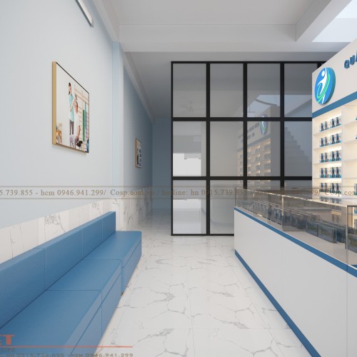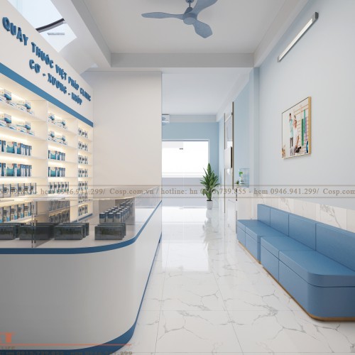 Thiết kế quầy thuốc phòng khám với mục tiêu chuẩn GPP, đảm bảo sự thông thoáng, hiện đại. Bố cục nội thất quầy thuốc theo kiểu truyền thống với hệ tủ thuốc cao sát tường và quầy thuốc chữ L thấp, ghế ngồi chờ cho khách hàng.