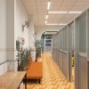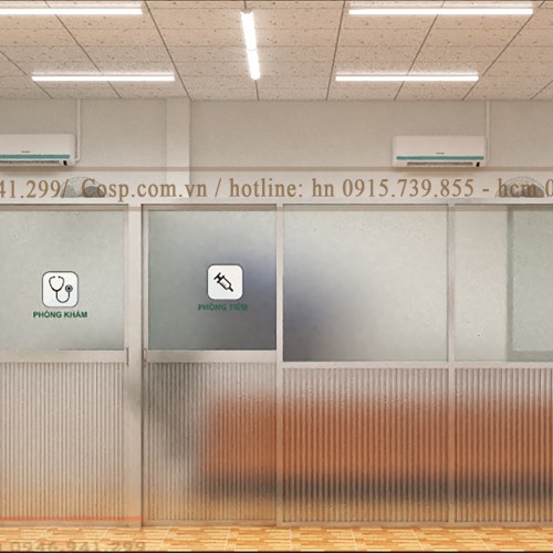 Ngăn cách giữa các phòng chức năng, kiến trúc sư tư vấn sử dụng hệ vách nhôm kính với khung nhôm với kính mờ đảm bảo sự riêng tư cần thiết khi thăm khám. Hơn nữa phương án này sẽ giúp chủ đầu tư tiết kiệm chi phí so với việc xây dựng tường gạch.