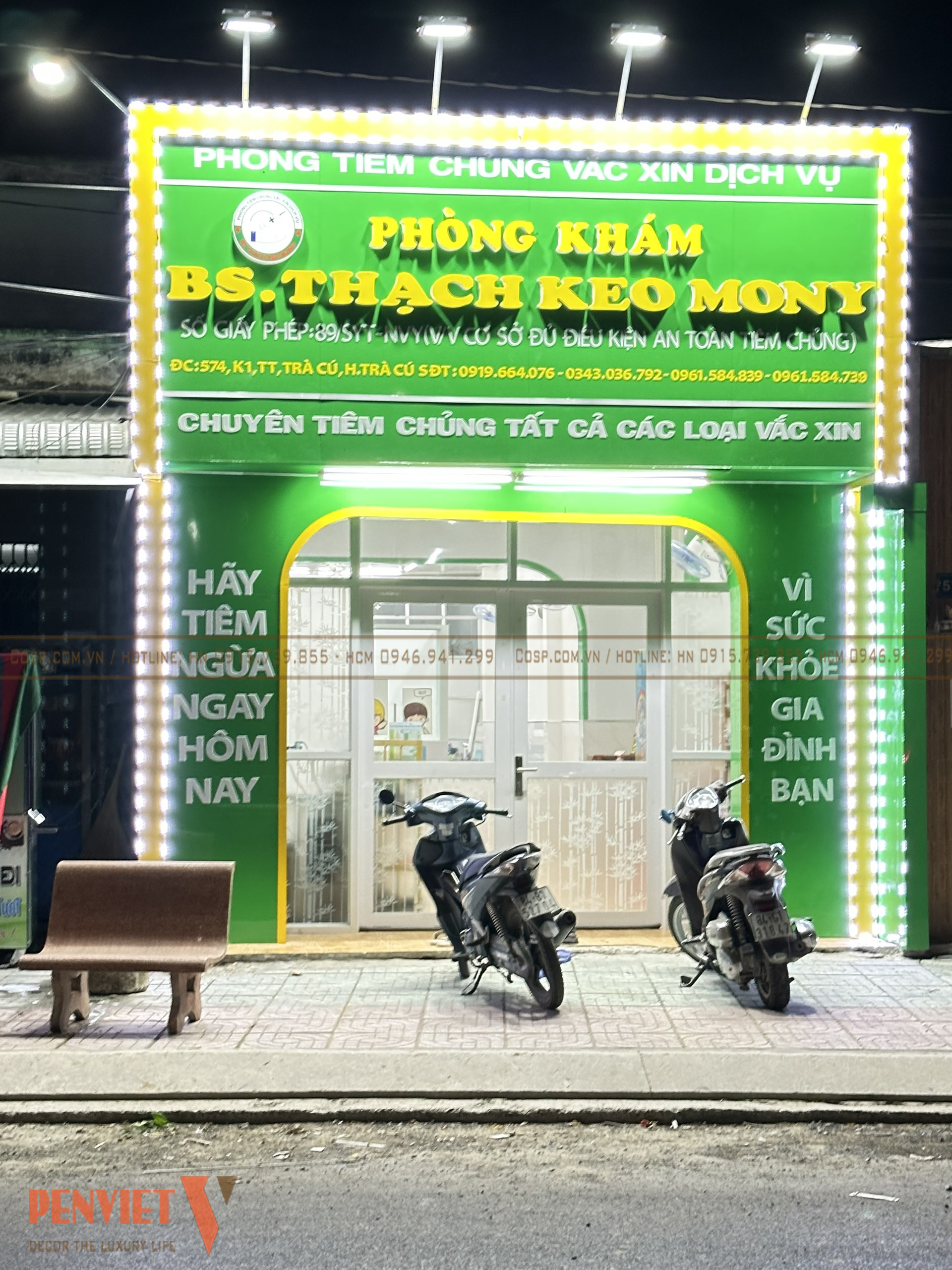 Đi theo tổng thể thiết kế phòng tiêm chủng, màu xanh được chúng tôi sử dụng để thiết kế biển quảng cáo bằng khung sắt hàn liên kết ốp Alu xanh viền vàng giật cấp 50. Sự lựa chọn thông minh này cũng giúp làm tôn lên bộ nhận diện thương hiệu bằng Mica.