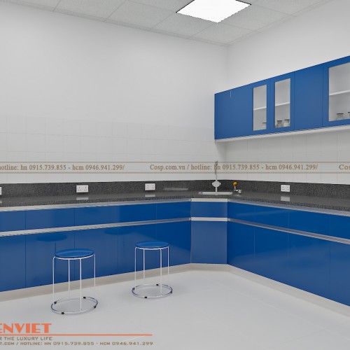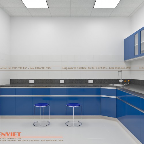 Đối với phòng thiết xét nghiệm thì vấn đề đảm bảo các điều kiện về cơ sở vật chất cũng phải đảm bảo tuyệt đối. Phòng xét nghiệm được trang bị đầy đủ thiết bị, trang bị hệ thống bàn thí nghiệm áp tường hộc tủ treo, phía trên lắp đặt thêm tủ treo tường.