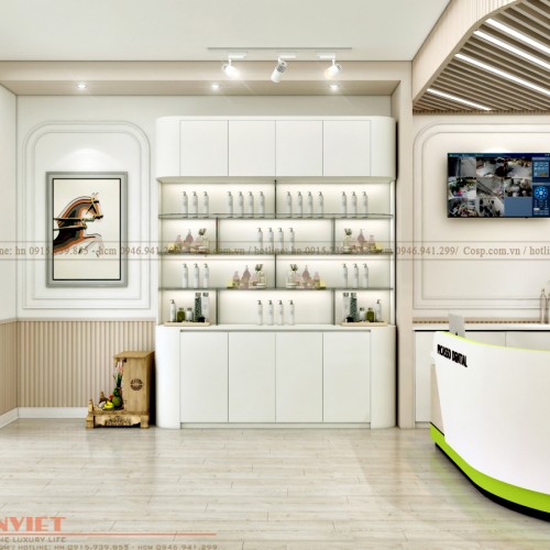 Đồ nội thất thiết kế đơn giản bằng chất liệu gỗ MDF bao gồm: bàn tư vấn, kệ treo tường. Để không gian không bị nhạt nhòa, chúng tôi đã trang trí décor bằng tranh in PP và đồng hồ kiểu dáng độc đáo.