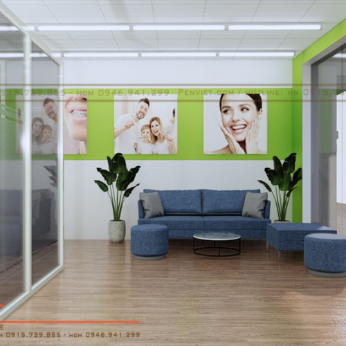 Nhằm làm tăng sự sinh động, Penviet cũng tô điểm thêm cho không gian bằng những chậu cây và hệ thống tranh in trong mẫu thiết kế phòng khám nha khoa Hoàng Minh.