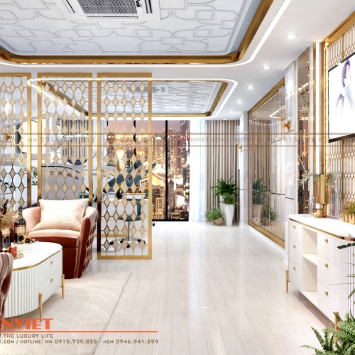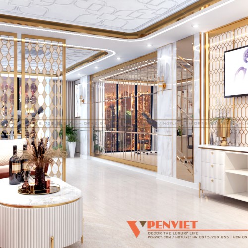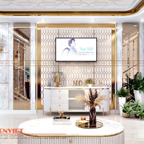 Không gian nội thất phòng tiếp đón khách hàng cũng gây ấn tượng nhờ vách treo tivi bằng khung gỗ nẹp V Inox kết hợp phần Inox cắt CNC lá dán trên nền gỗ sơn bóng bắt mắt.