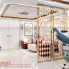 Nhằm đáp ứng những yêu cầu của chủ đầu tư về không gian khám chữa bệnh chuyên nghiệp, chúng tôi đã tư vấn cho chị Hoài thực hiện phân chia không gian bằng cách lắp đặt vách ngăn CNC khung inox, họa tiết quả trám tinh xảo, bắt mắt để tạo sự riêng tư, thoải, đồng thời cũng làm toát lên tinh thần trong phong cách thiết kế phòng khám nha khoa Smile Center.