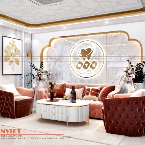 Chị Hoài - chủ đầu tư dự án thiết kế phòng khám nha khoa Smile Center tỏ ra rất hài lòng bởi phần setup vách sau bộ sofa bằng gỗ MDF cốt Thái chống ẩm ốp PVC vân đá, tráng ceramic cao cấp, làm tôn lên bộ logo thương hiệu bằng hộp Mica Đài Loan UV phát sáng mặt. Các chi tiết bo khung viền sơn nhũ vàng, nẹp chỉ T inox vừa tạo điểm nhấn thu hút, vừa mang tới vẻ sang trọng cho nội thất của phòng khám nha khoa này.