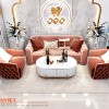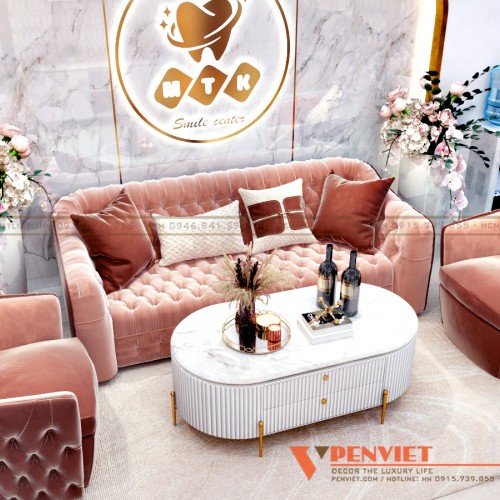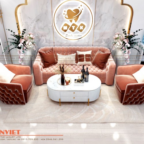 Không gian phòng khách được setup bộ ghế sofa khung gỗ tự nhiên, bọc nệm nhung mịn phối 2 màu mang đến sự êm ái cho người sử dụng. Bàn trà khung gỗ MDF mặt đá tự nhiên có ngăn kéo, chân và mép bàn bo tròn mạ inox vàng cũng làm toát lên vẻ đẹp sang trọng, hiện đại trong ý tưởng setup phòng khám nha khoa này.