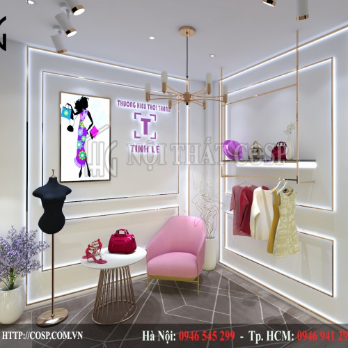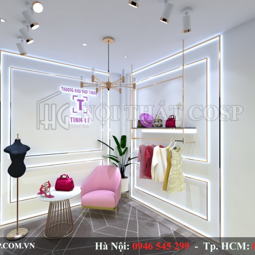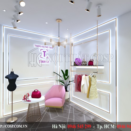 Cuối cùng là giá treo và kệ trưng bày một số sản phẩm thời trang có màu vàng ánh kim được thiết kế liền tường để tạo nên sự cách điệu thú vị. Tất cả giúp tạo nên một khu vực livestream cho thiết kế shop thời trang vô cùng đẹp.