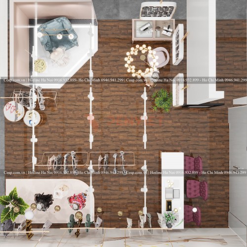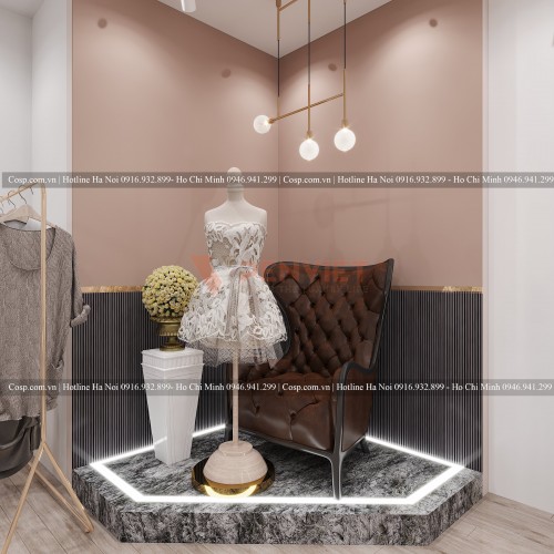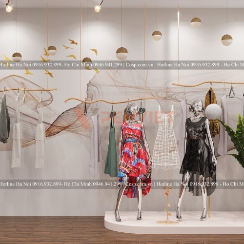Bục gỗ MDF phủ melamine chống ẩm sẽ là nơi để manocanh, phía sau là bức tường được trang trí bới tranh dán tường. kèm theo đó là hệ mắc treo quần áo bằng inox mạ vàng.
