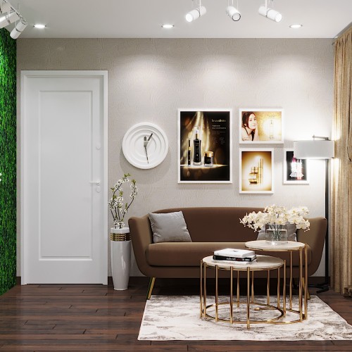 Đối diện là khu vực tư vấn, chăm sóc khách hàng. Sử dụng bộ sofa da màu nâu sang trọng, bàn trà 2 tầng chân inox mạ vàng sang chảnh.
